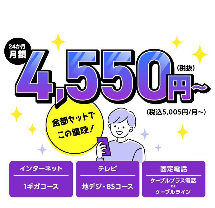 本プランは、インターネットサービス・テレビサービス・電話サービスの3サービスすべてをセットでお申し込みいただいた方が対象となります。インターネットサービスについては、1ギガコースをご利用の場合に限り、対象となります。