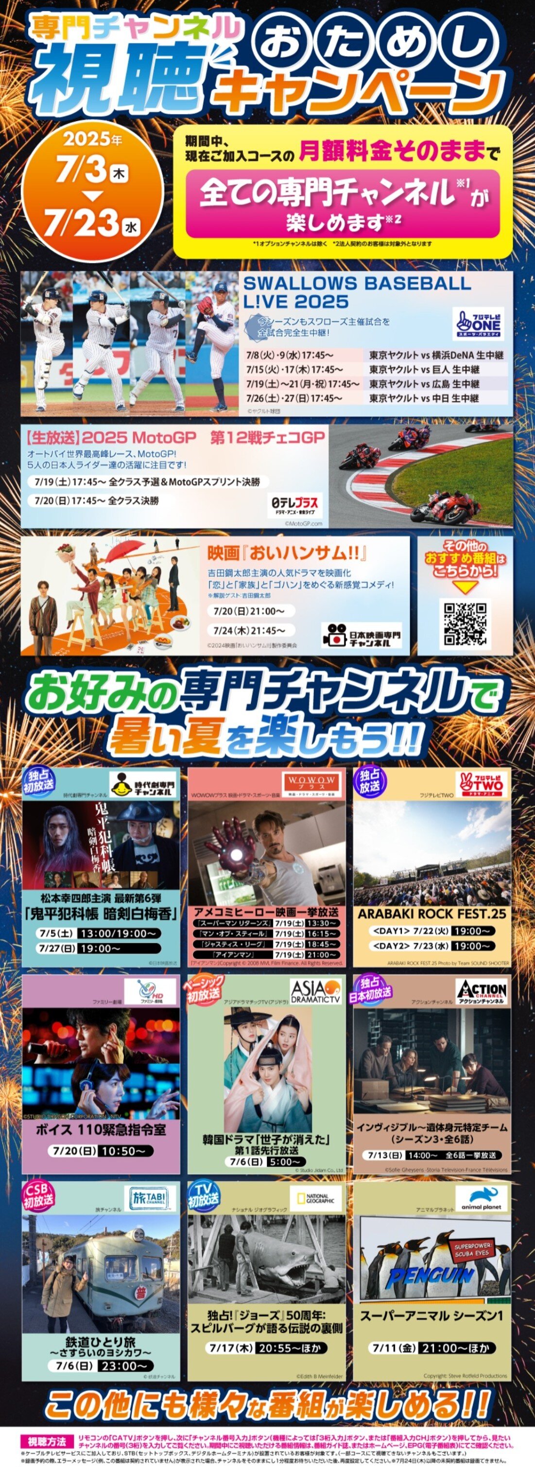 専門チャンネルおためし視聴キャンペーンのお知らせ(7/3~7/23) 2025.07.01 キャンペーン おためし視聴キャンペーン実施! 7/3(木)~7/23(水)まで、専門チャンネルおためし視聴キャンペーンを実施いたします。※STB設置の加入者様に限りこの機会にぜひ思う存分専門チャンネルをご覧ください! お知らせ一覧に戻る