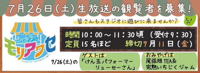 7月から情報番組『モリアワセ』の公開生放送を毎月第4土曜日に行います!