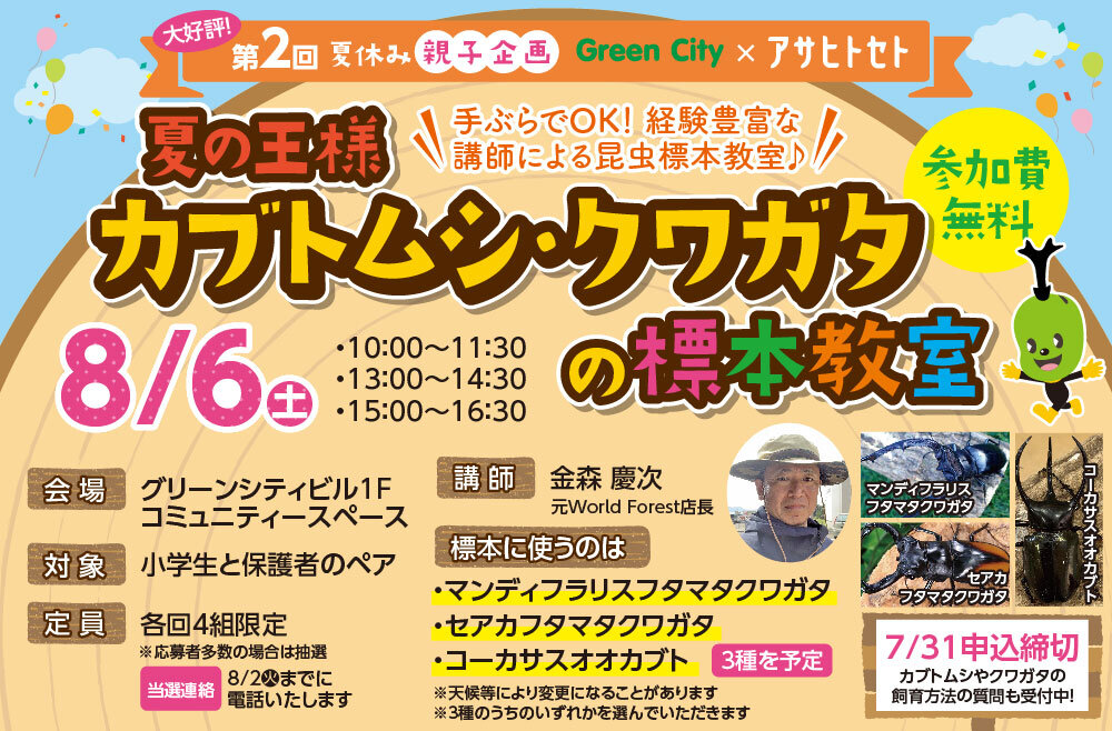 2022年8月6日(土)、グリーンシティプラザにて「夏の王様 カブトムシ・クワガタの標本教室」を開催いたします。