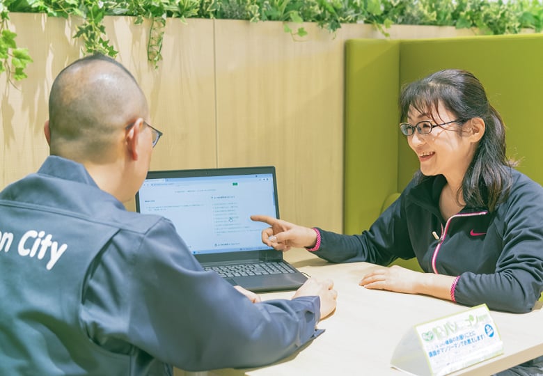 パソコンやスマートフォンのお困りごとに講師やショップスタッフがマンツーマンで操作をアドバイスするサービスです。パソコンならグリーンシティプラザだけでなく、オンラインでもご利用可能です。