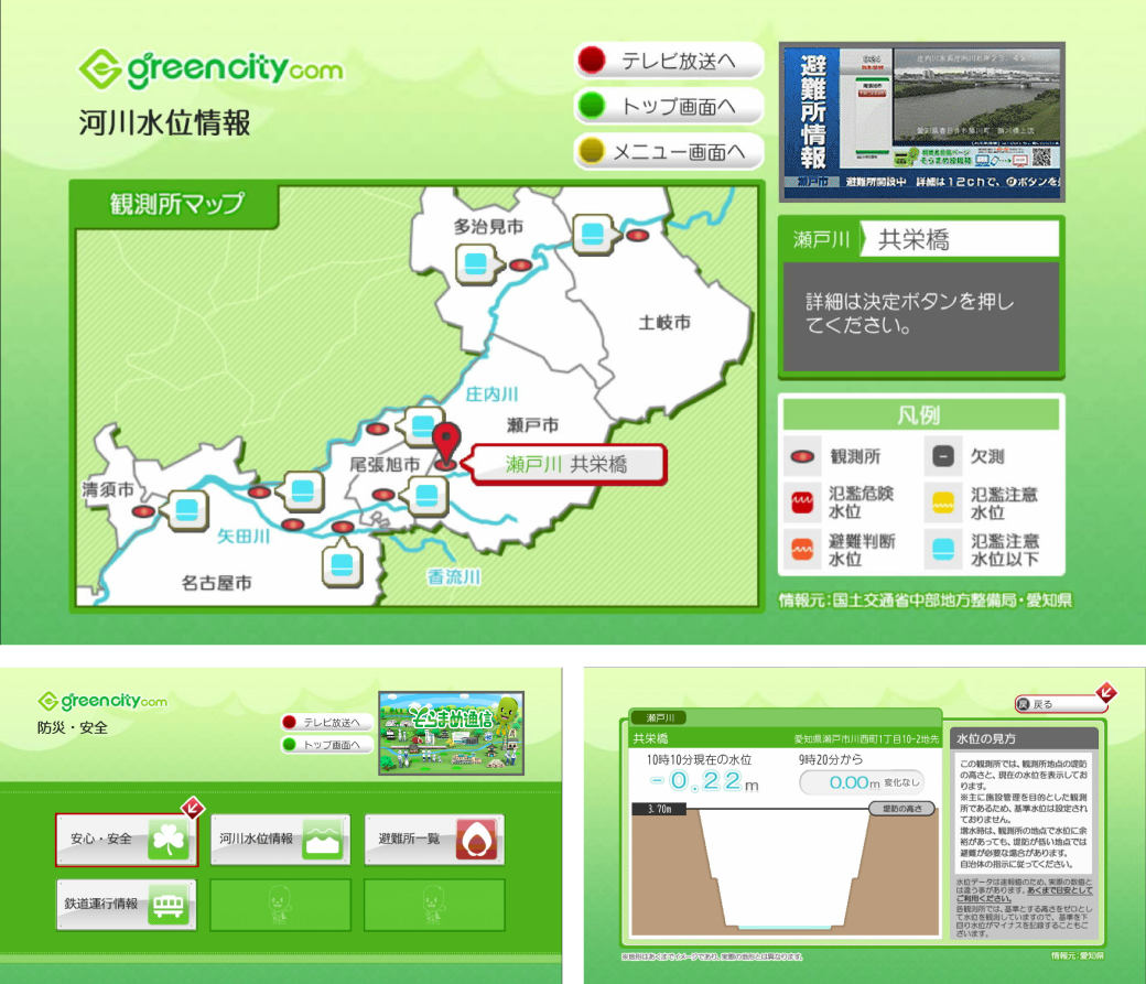 データ放送で設定されている地域の安全情報やエリアに関係する河川の水位情報、避難所一覧など地域の安全に関する情報をお届けします。