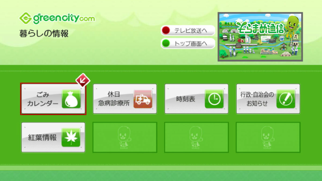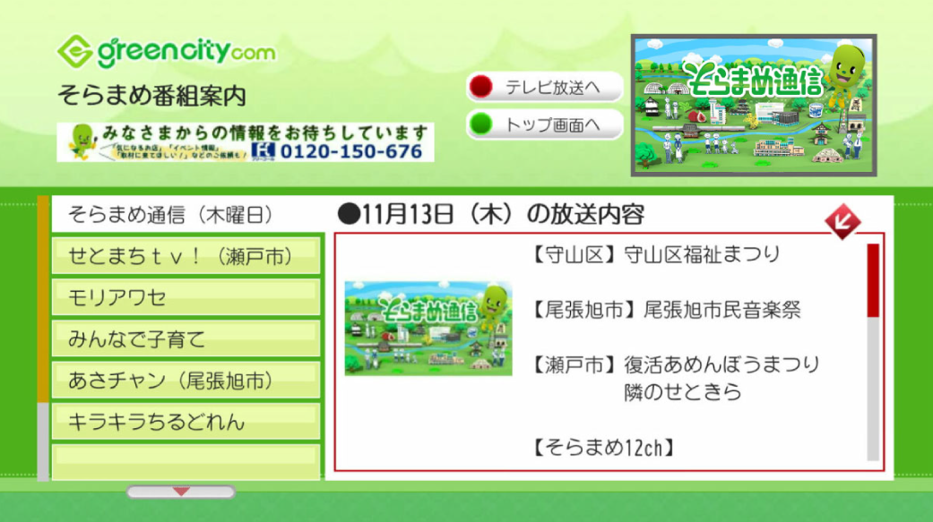 データ放送で設定されている地域のごみ出しカレンダー、休日急病診療所、現在の鉄道運行情報と「名鉄瀬戸線 大曽根駅・守山自衛隊前駅~尾張瀬戸駅」「JR中央線 大曽根駅・新守山駅・高蔵寺駅」「愛知環状鉄道 山口駅~高蔵寺」「ゆとりーとライン 大曽根停留所・守山停留所・金屋停留所をはじめとするグリーンシティエリアの停留所」の時刻表を案内しています。