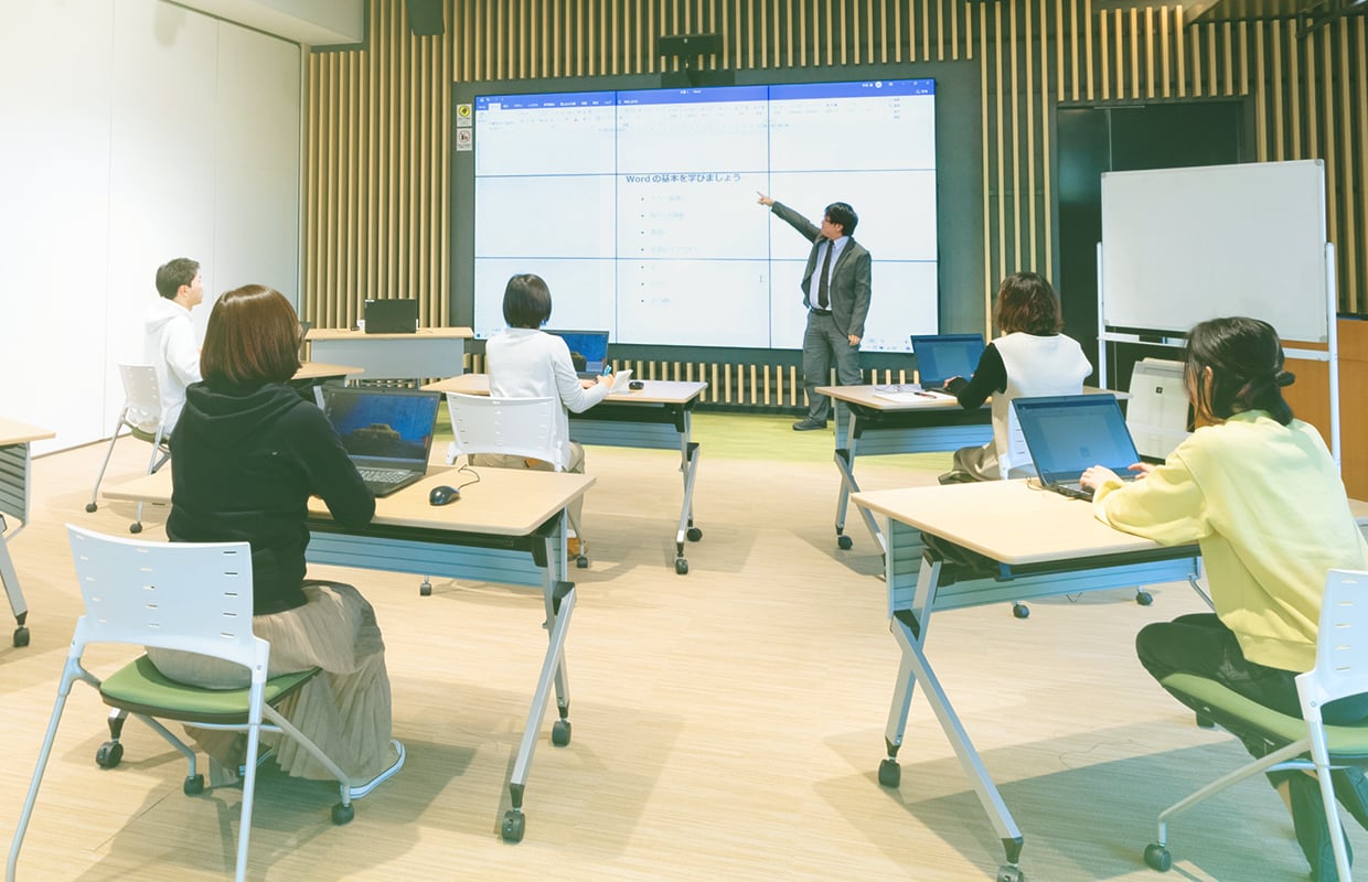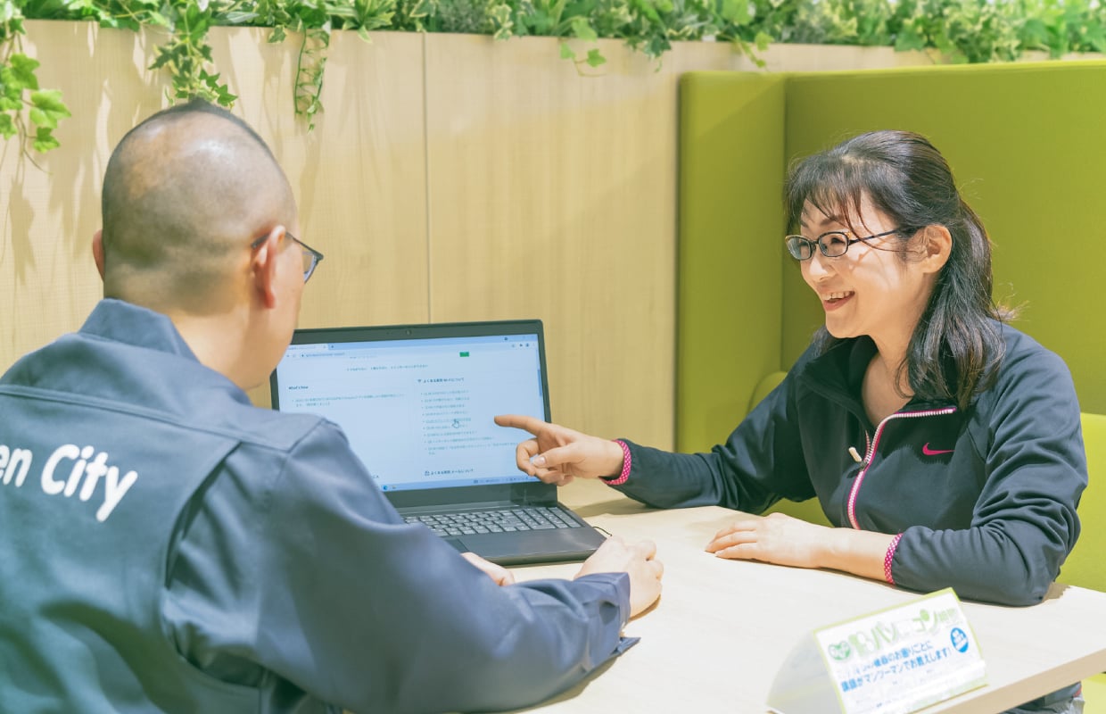 パソコンやスマートフォンのお困りごとに講師やショップスタッフがマンツーマンで操作をアドバイスするサービスです。パソコンならグリーンシティコムプラザだけでなく、オンラインでもご利用可能です。